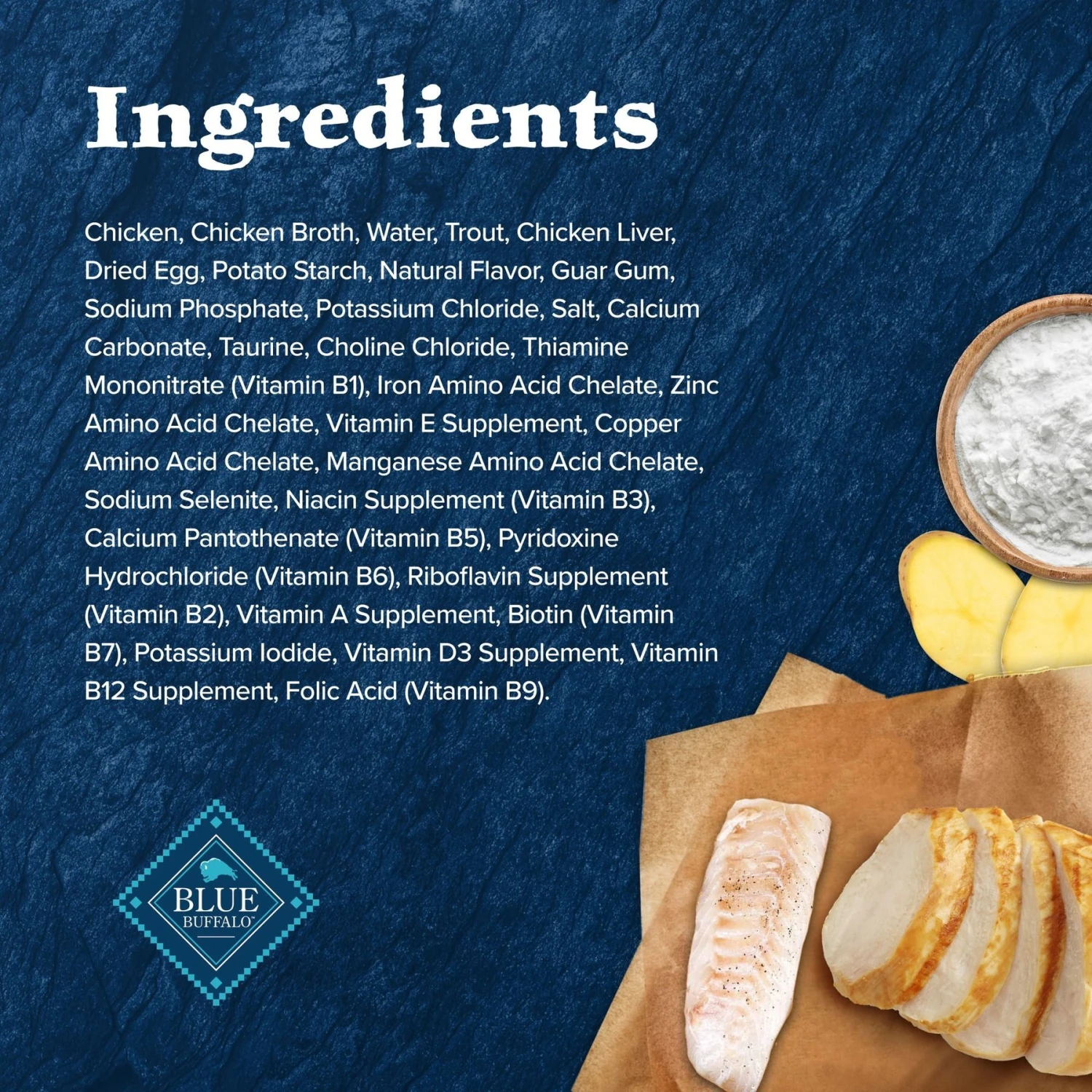 See your sidekick satisfied at suppertime with Blue Buffalo Wilderness Wild Delights High Protein Grain Free, Natural Adult Meaty Morsels Wet Cat Food. Purr-fect for your grown-up gal, this irresistibly tasty wet food is made using only the finest naturally grain and gluten-free ingredients. It starts with high-protein chicken and trout, packed with healthy fruits and veggies, then enhanced with vitamins and minerals. Formulated to support the nutritional needs of adult cats, the exclusively wholesome ingredients do not contain any grain, gluten, by-product meals, corn, wheat, soy, artificial flavors or preservatives.