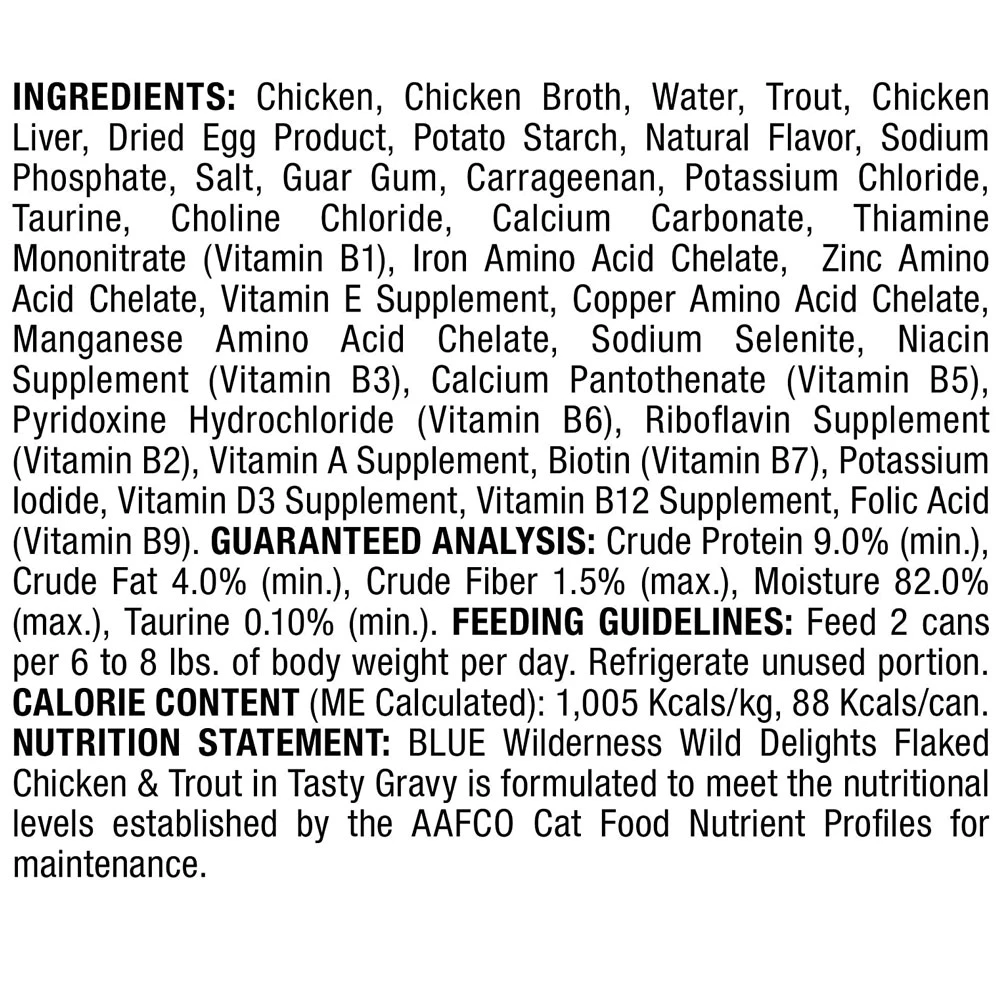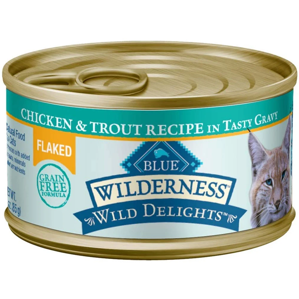 Blue Wilderness Wild Delights Flaked Chicken & Trout goes a step beyond our protein-rich Wilderness recipe and boasts two tasty meats for your feline to enjoy. Tender flakes of real chicken and succulent trout are accompanied by a rich gravy, making this a true feline favorite.