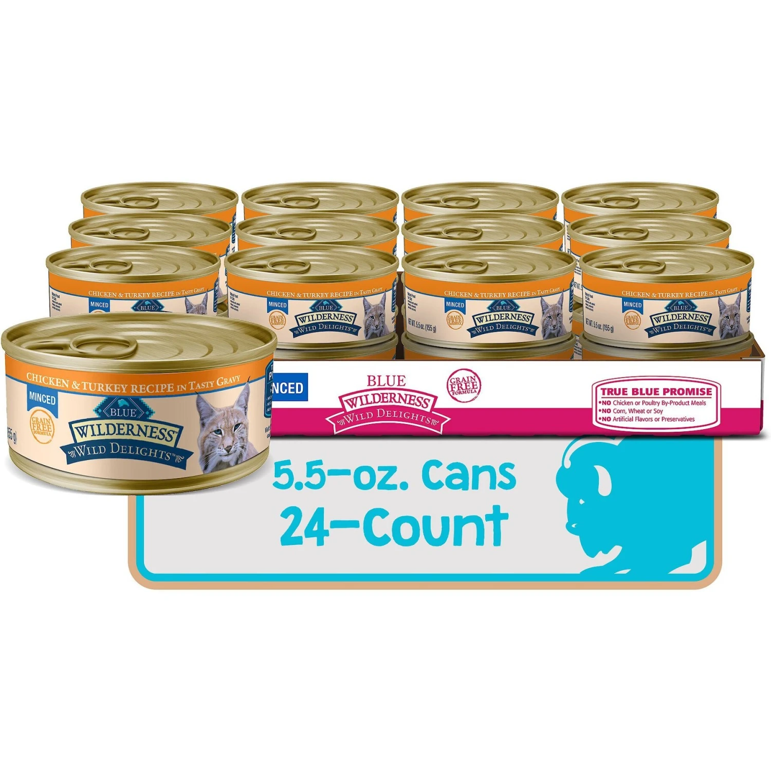 Power your pal with poultry protein-packed Blue Buffalo Wilderness Wild Delights High Protein Grain Free, Natural Adult Minced Wet Cat Food. Purr-fect for your adult amigo, this irresistibly tasty wet food is made using only the finest naturally grain and gluten-free ingredients. It starts with high-protein chicken and turkey, packed with healthy fruits and veggies, then enhanced with vitamins and minerals. Formulated to support the nutritional needs of adult cats, the exclusively wholesome ingredients do not contain any grain, gluten, by-product meals, corn, wheat, soy, artificial flavors or preservatives.